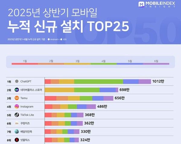 뉴시스 보도에 따르면, 9일 모바일인덱스에 따르면 챗GPT의 상반기 앱 누적 설치 건수는 1012만건으로 전체 모바일 앱 중 1위로 올랐다.