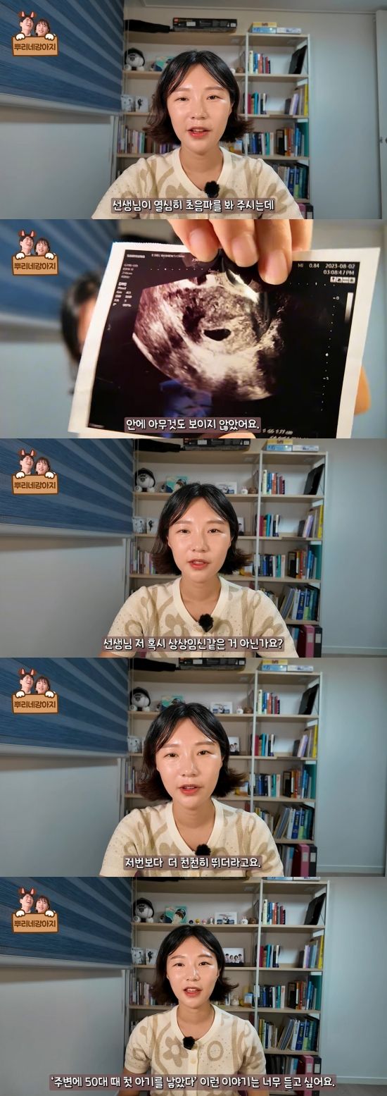 이어 "그런데 생리를 안 하는 거다. 저는 불규칙한 편이기 때문에 한 번 버텨봤다. '난 다시 속지 않아. 난 임테기 아낄 거야'했는데 두 줄이 나왔다. 그때 너무 감동했다. 임밍아웃 할 것도 없이 전화로 두 줄이야 말했고 남편도 엄청 기뻐했다. 바로 병원으로 갔더니 0.4cm 조그마한 아기집을 봤다. 4주 5일이라서 2주 뒤에 심장 소리를 들으러 오라고 했다. 2주 동안 입덧을 하면서 기다려서 병원을 갔는데 적막이 흐르더라. 선생님이 열심히 초음파를 봐주시는데 분명 아기집은 있는데 아무것도 안 보였다. 고사난자 같다고 했다. 난자가 자라다가 고사됐다는 뜻이다. 너무 충격적이었다. 밖에 나와서 눈물을 참을 수가 없어서 엉엉 울었다"고 털어놨다.