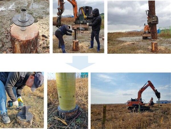 농촌진흥청이 간척지 연약지반에 구조물을 안정적으로 설치할 수 있도록 나무와 섬유강화플라스틱(FRP)을 결합한 복합기둥 공법을 개발했다고 9일 밝혔다.