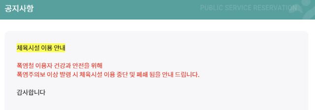 하지만 이외 대부분 시설은 폭염 속에도 이용할 수 있다. 관악구 난우공원 테니스장은 고온이든 저온이든 기온으로 인한 환불은 불가하다고 안내하고 있기도 하다.