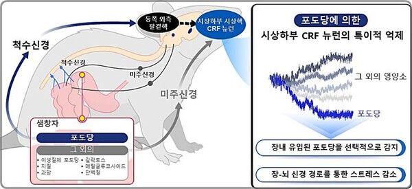 이 회로를 통해 뇌의 '스트레스 반응 세포(CRF 뉴런)'가 배고픔이나 외부 자극뿐만 아니라 소장에 직접 유입된 특정 열량 영양소에 대해서도 초 단위로 반응하며 특히 포도당(D-glucose)에 선택적으로 반응한다는 사실을 처음으로 입증했다.