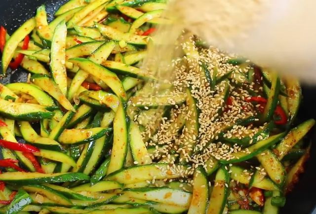 팬에 식용유 1큰술과 다진 마늘 0.5작은술을 넣고 중약불에서 살짝 볶아 향을 낸 뒤, 손질한 오이를 넣고 볶는다. 여기에 국간장 1작은술, 참기름 0.5작은술을 더하고 전체적으로 간이 배도록 볶는다. 너무 오래 볶으면 오이가 흐물해지니 2~3분 정도만 살짝 익히는 게 좋다. 마지막에 깨소금을 솔솔 뿌려 고소함을 더하면 완성이다.