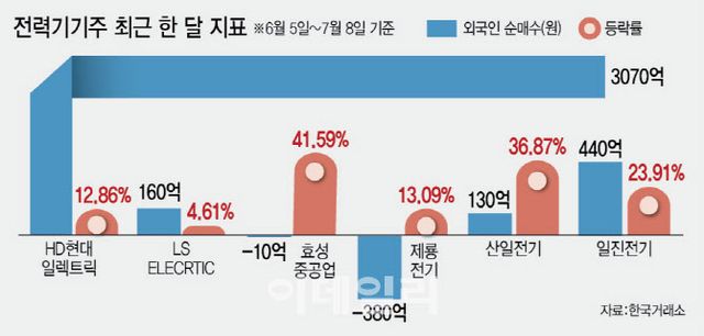 외국인이 160억원어치를 사들인 LS ELECTRIC(010120)도 이 기간 소폭(4.61%) 오름세를 기록했다. 이 외에도 효성중공업(298040)이 한 달새 40% 넘게 상승했고 제룡전기(033100)도 10%대 강세를 보였다.