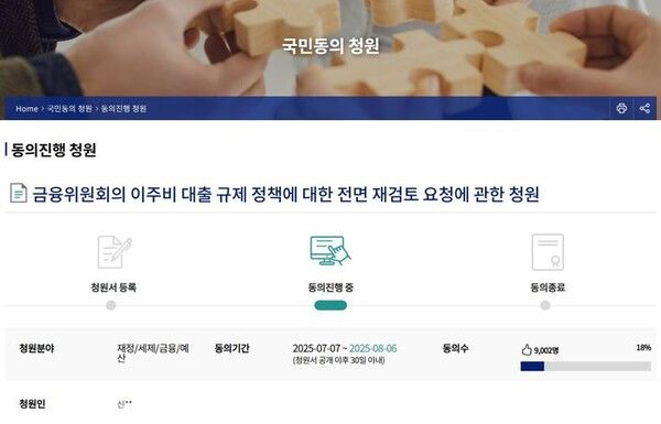뉴시스 보도에 따르면, 9일 국회 국민동의 청원 게시판에 따르면 지난 7일 게시된 '금융위원회의 이주비 대출 규제 정책에 대한 전면 재검토 요청에 관한 청원'은 이날 오후 5시 기준 9000명 이상의 동의를 얻었다.