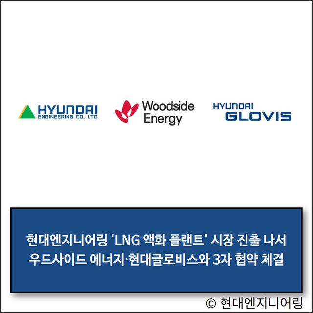 현대엔지니어링이 호주 우드사이드 에너지(Woodside Energy), 현대글로비스와 'LNG액화 사업 개발'을 위한 3자간 업무협약을 체결했다.