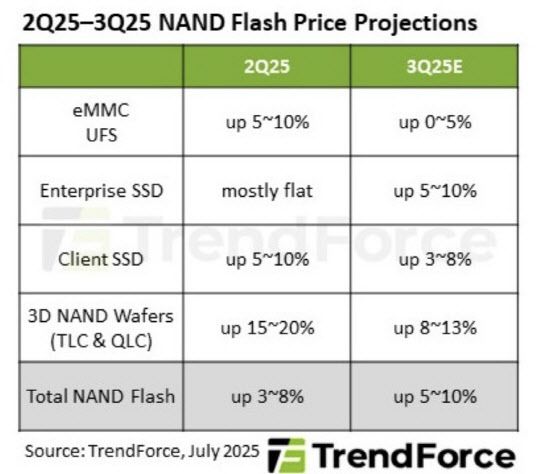 품목별로 보면 3분기 기업용 솔리드스테이트드라이브(SSD) 평균 계약 가격은 5~10%, 고객용 SSD는 3~8% 오를 것으로 예상된다. 멀티미디어카드(eMMC)·범용플래시저장장치(UFC)는 각각 0~5%의 상승이 전망된다. 3D 낸드 웨이퍼 가격은 8~13% 상승할 것으로 트렌드포스는 내다봤다.