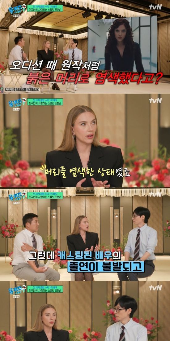 유재석은 "블랙 위도우 오디션 때 진짜 원작처럼 머리 염색을 하고 가서 오디션을 보셨다더라"라며 궁금해했고, 스칼릿 조핸슨은 "머리를 염색한 상태였다. 오디션을 보고 감독님과 캐릭터 이야기도 했는데 오디션에 합격하지 못했다. 굉장히 실망했다"라며 회상했다.