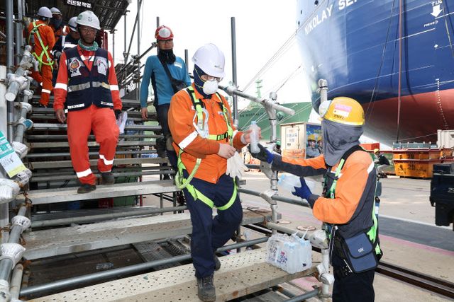 ‘찾아가는 얼음생수’ 활동은 폭염에 가장 취약한 작업장을 대상으로 진행된다. 안벽 작업장 등 실외 작업이 빈번한 곳을 직접 찾아가 폭염 시 하루 300개 이상의 얼음생수를 제공한다. 오는 8월 말까지 지속적으로 진행할 예정이다. 식당과 주요 휴게소 등에서의 얼음생수 지급량 또한 확대한다. 한화오션은 지난해 178만개의 얼음생수를 지급한 바 있다.