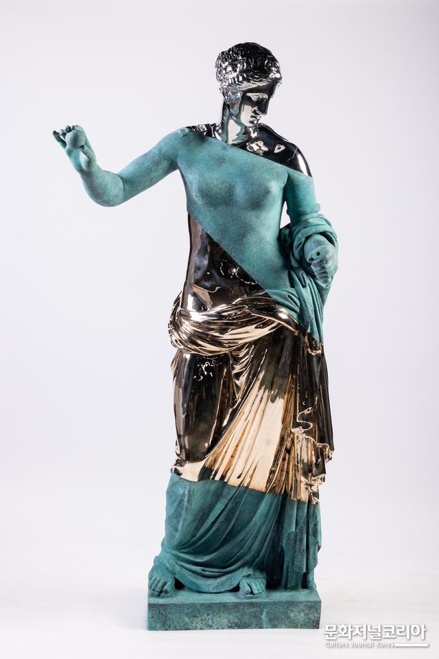 원작은 기원전 1세기 그리스에서 제작된 테스피아이의 아프로디테상으로, 17세기 프랑스 아를에서 발굴되었다. 아샴은 루브르의 석고 원형을 바탕으로 실물 크기 복제본을 제작하며, 고대에는 상상할 수 없었던 재료들을 결합해 현재 기술적 한계마저 시험하는 혼성 조형을 선보인다.