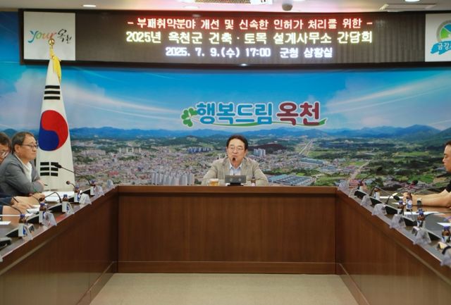 이번 간담회는 옥천군 건축사 협회 및 토목설계협회 20여명과 함께했으며 인허가 주요 반복 보완 요청사항에 대한 개선방안 논의, 부패 취약분야에 대한 의견 수렴과 옥천군 건축‧토목설계사 간 협조사항 및 발전사항을 논의하기 위해 마련됐다.