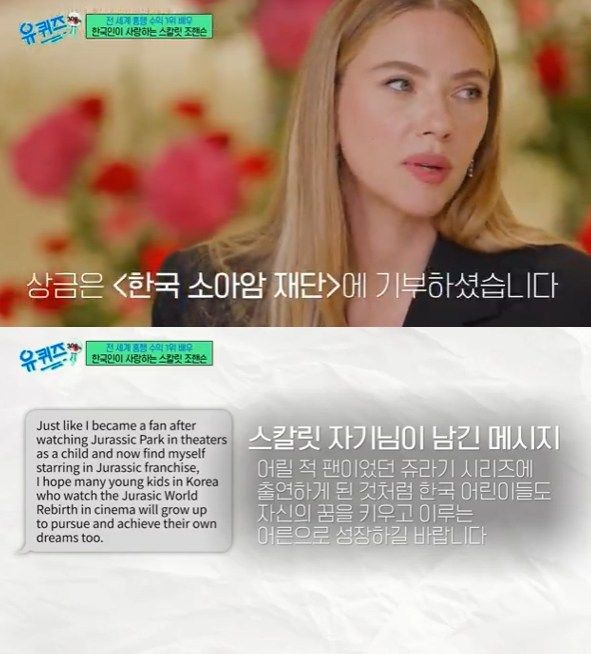유재석·조세호와 만담을 나눈 스칼렛 요한슨은 이날 방송 말미 퀴즈를 맞춰 상금을 손에 넣었다. 이 가운데 스칼렛 요한슨이 상금을 한국 소아암 재단에 기부했다는 소식이 '유퀴즈' 자막을 통해 전해졌다.