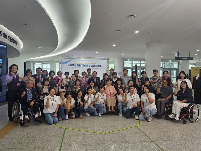 정경자 의원이 7월 8일, 경기도의회 1층 로비에서 개최된 「장애여성 불편개선 맞춤의상쇼」에 참석해 기념사진 촬영을 하고 있다.