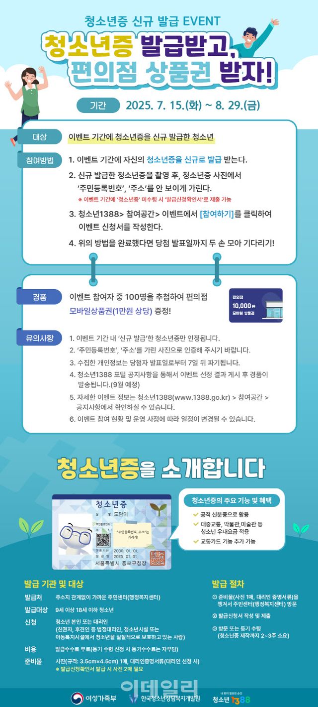 이번 행사는 여름방학을 맞아 청소년들이 청소년증을 적극적으로 활용해 다양한 혜택을 누릴 수 있도록 청소년증 발급을 장려하기 위해 마련됐다. 행사 기간 청소년증을 신규로 발급하고 청소년1388포털에 청소년증 인증사진을 남기면 100명을 추첨해 1만원 상당의 편의점 모바일 상품권을 준다.