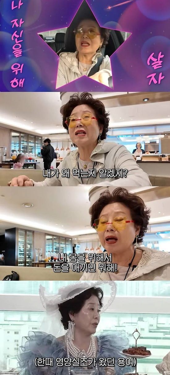 과거 영양실조와 뇌경색을 겪었던 선우용여는 고급 승용차를 타고 호텔을 찾아 조식을 챙겨 먹는 일상을 전하며 "남편이 돌아가시고 애들도 시집 가고 그러면 누굴 위해 살아야 하냐. 나를 위해서 살아야 한다"고 호텔을 찾게 된 이유를 말했다.