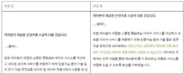 개정 약관에는 사용자가 제공한 콘텐츠를 네이버가 서비스를 개선하거나 AI 분야 연구 개발 목적으로 네이버 또는 네이버 위탁으로 사용할 수 있다는 점을 분명히 했다.