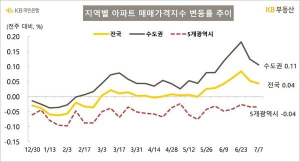 KB부동산은 "5~6월 거래된 실거래가 시차를 두고 반영되면서 일부 지역은 상승폭이 소폭 확대됐으나 6·27 대출 규제 이후 매수 심리 위축으로 관망세가 짙어지면서 전반적으로 상승률은 둔화하는 추세"라고 분석했다.