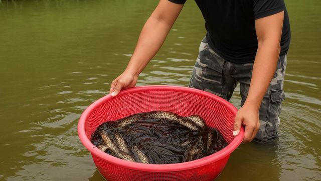 낚시꾼에 의해 소쿠리째 잡힌 쏘가리들. AI로 생성한 자료사진.