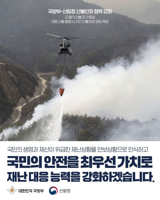 이는 최근 경북·경남 지역에서 발생한 대형산불에 따른 피해를 계기로 국민의 생명과 재산이 위급한 재난상황을 안보상황으로 인식하고, 대형산불의 신속한 진화를 위해 초기 단계부터 군 자산을 한층 적극적으로 투입하기로 했다.