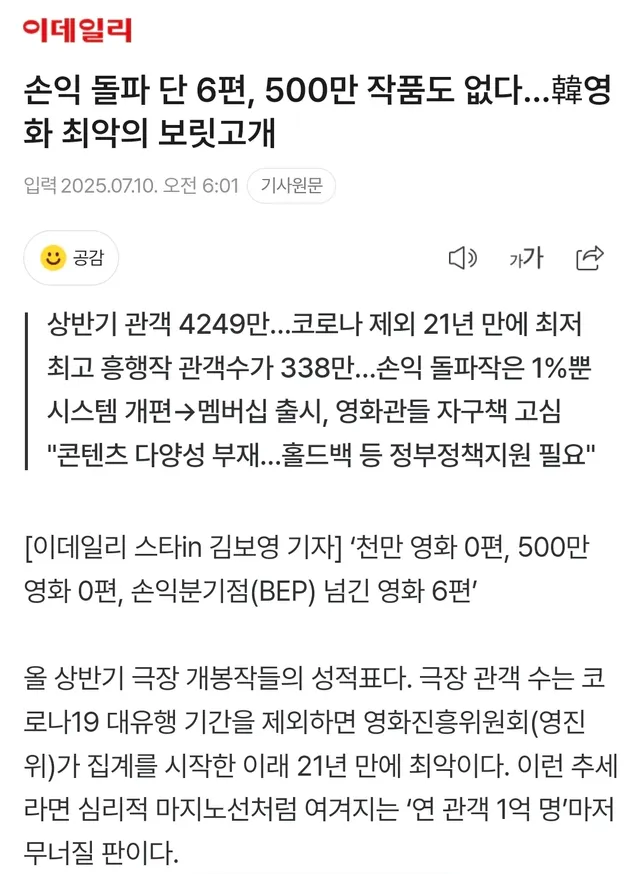 올해 상반기도 지났는데 아직까지 이름 들어볼법한 한국영화는 없네