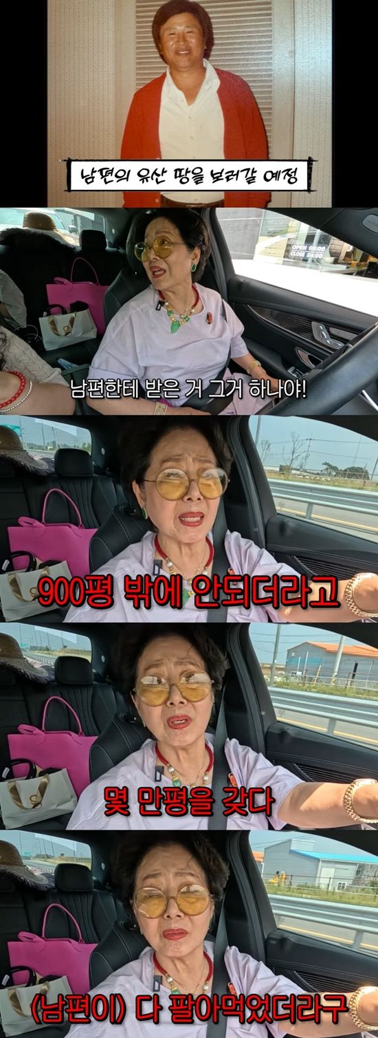 이어 그는 "내 땅은 선산이었다. 측량을 했더니 900평밖에 안됐다. (남편이) 몇만 평을 다 팔아먹었다"라며 땅의 규모를 설명했다.