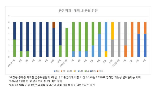 금통위원들의 3개월 내 금리전망에서 인하 가능성을 열어둔 위원이 4명으로 동결을 주장한 위원(2명)의 두 배였지만, 3개월 이내에는 10월까지 포함된다는 점도 고려해야 한다.