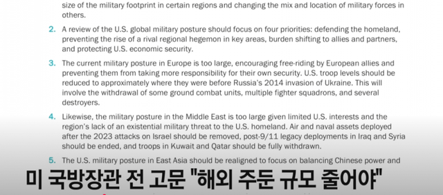 미국이 세계 '무료 경비원' 역할을 멈추고 해외 주둔 규모를 줄여야 한다는 게 골자입니다.
