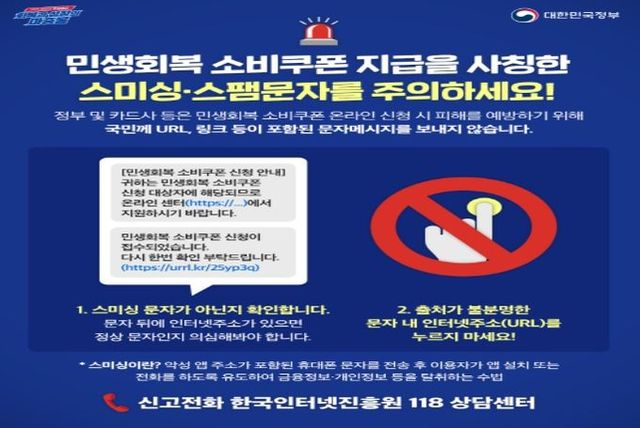 특히, 스미싱 피해를 사전 예방하기 위해 정부·카드사·지역화폐사는 민생회복 소비쿠폰과 관련하여 ‘인터넷 주소 바로가기(URL·링크)’가 포함된 문자 및 SNS는 일절 발송하지 않을 예정이다.