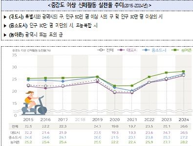 우리나라 성인 26.6%만이 중강도 이상 수준의 신체활동을 실천하고 있는 것으로 조사됐다.