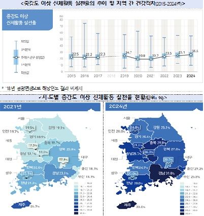 지영미 질병관리청장은 “중강도 이상의 신체활동은 질병 예방을 넘어 건강한 노화와 삶의 질 증진을 위한 필수 요소”라며 “가벼운 운동부터 시작해 숨이 찰 정도의 운동까지, 일상 속에서 실천할 수 있는 작은 움직임을 꾸준히 이어가는 것이 중요하다”고 강조했다.