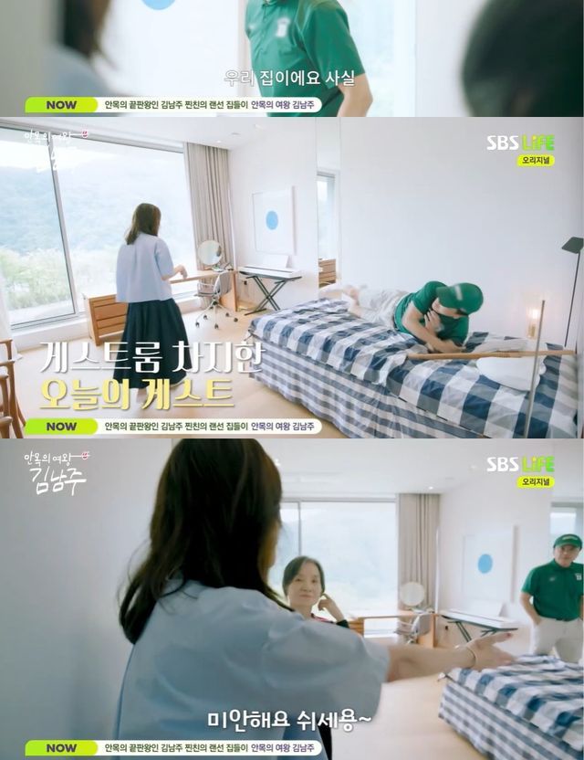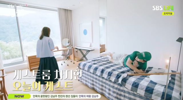 김남주는 "여기 남편이 같이 놀러 왔다"고 설명했고, 이어 "하고 빨리 나갈게"라며 게스트룸 내부를 소개했다.