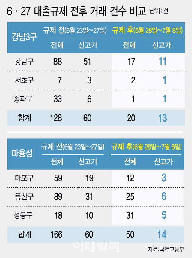 대출 규제가 시행되기 전 일주일(6월 23~27일) 동안 마용성 지역에선 166건이 거래됐는데 이중 60건(36.1%)이 신고가를 기록했던 것과 비교해 신고가 행진이 주춤해진 것이다.