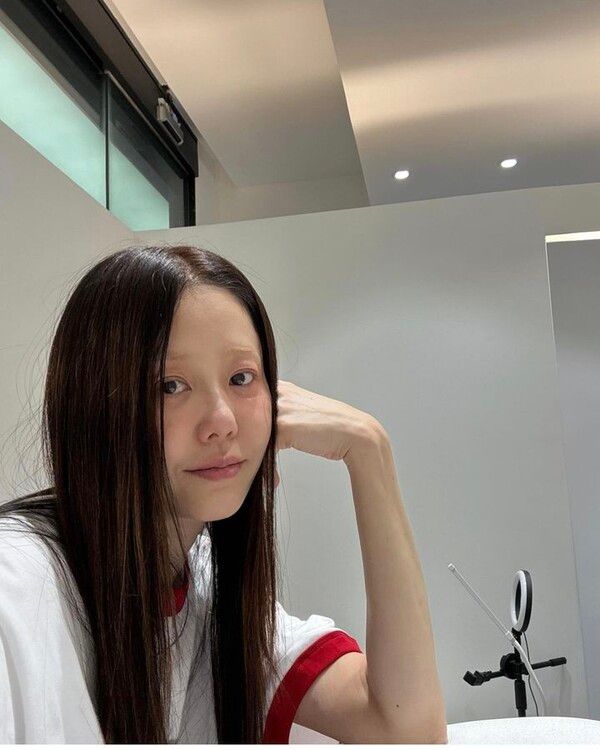 눈썹도 그리지 않은 민낯을 공개했다. 잡티 하나 없는 매끈한 피부가 이목을 끌었다.