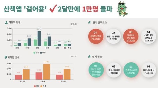 ‘걸어용’은 사용자의 건강상태와 선호도에 맞춰 산책로를 추천하는 앱으로 용인특례시가 직접 개발해 5월부터 서비스를 제공했다. 65세 이상의 사용자는 5000보 이상, 65세 미만은 8000보를 걸으면 일 최대 100포인트의 ‘시티포인트’도 받을 수 있다.