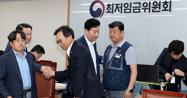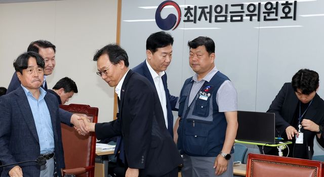 지난 10일 저녁 세종시 정부세종청사 고용노동부에서 열린 최저임금위원회 제12차 전원회의에서 사용자위원과 한국노총 근로자위원들만이 참여하여 2026년 최저임금을 10,320원으로 합의하며 류기정 사용자위원, 류기섭 근로자위원, 권순원 공익위원 등이 인사를 나누고 있다. / 뉴스1