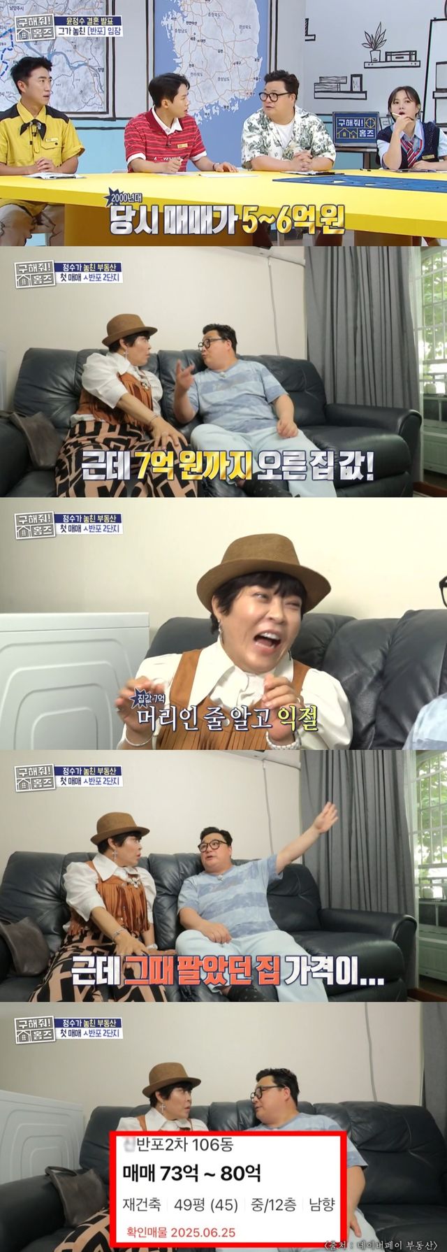 재건축 등 미래 기대감이 포함된 가격 상승에 "이 아파트가? 아까 본 게?"라며 발칵 뒤집혔고, 윤정수는 "내가 판 건 7억인데"라고 되뇌여 눈길을 끈다.
