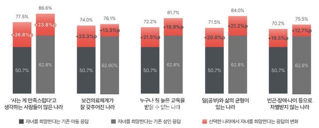 아동이 선택한 나라는 △삶의 만족도가 높고 안전사고나 범죄 위험이 적은 나라(38.6%) △보건의료 체계가 잘 갖춰진 나라(21.9%) △사회경제적 배경에 따른 차별이 없는 나라(18.8%) △성공하면 돈을 많이 벌 수 있는 나라(16.8%) 등의 순으로 나타났다. 성인 역시 40.4%가 ‘삶의 만족도가 높은 나라’를 꼽았다.