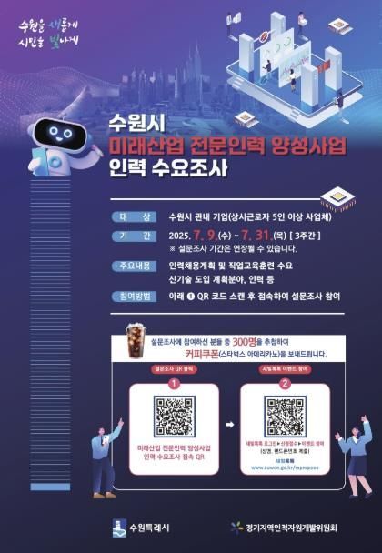 조사 대상은 관내 상시근로자 5인 이상 사업체다. ‘수원시 미래산업 전문인력 양성사업 인력 수요조사’ 포스터에 있는 큐알(QR) 코드로 접속해서 설문조사에 참여하면 된다. 조사 참여 후 새빛톡톡 홈페이지 또는 앱 ‘신청접수 ' 이벤트 참여’에서 이름·휴대전화 번호를 제출하면, 참여자 중 300명을 추첨해 모바일 커피쿠폰을 제공한다.