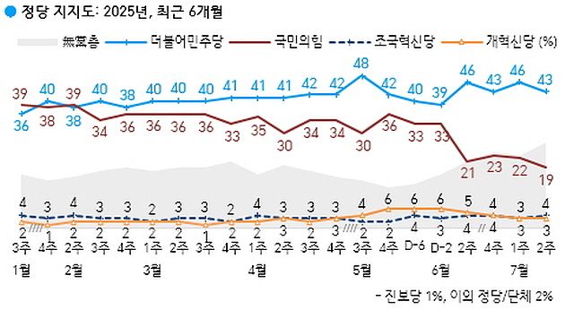정당 지지도는 더불어민주당 43%, 국민의힘 19%, 조국혁신당 4% 등으로 집계됐다. 민주당·국민의힘 모두 전주 대비 3%포인트 하락했다.