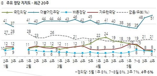 갤럽은 "국민의힘 지지도가 20%를 밑돌기는 2020년 11월 이후 처음"이라며 "그해(2020년) 국민의힘은 월평균 기준 최저 18%(2020년 5, 6, 10월)에서 최고 24%(8월), 민주당은 34%(12월)에서 46%(5월) 사이를 오르내렸다"고 분석했다.