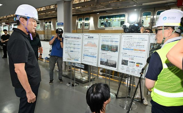 오 시장은 9호선 운영 현황과 폭염 대비 대책을 청취한 뒤 전동차에 올라 열차 내 혼잡도를 감지해 냉방 강도를 자동으로 조정하는 ‘자동냉방제어시스템’을 살폈다. 이어 열차가 드나드는 입출고선으로 이동해 폭염 시 스프링클러로 물을 분사, 선로 열을 내려주는 ‘레일 자동 살수설비’도 점검했다.