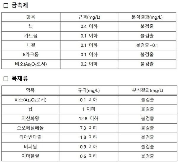 도마, 주걱 등 목재류 조리기구 96건(6품목)에 대해 납, 비소, 이산화황 등 7종을 분석한 결과 모두 검출되지 않았다.
