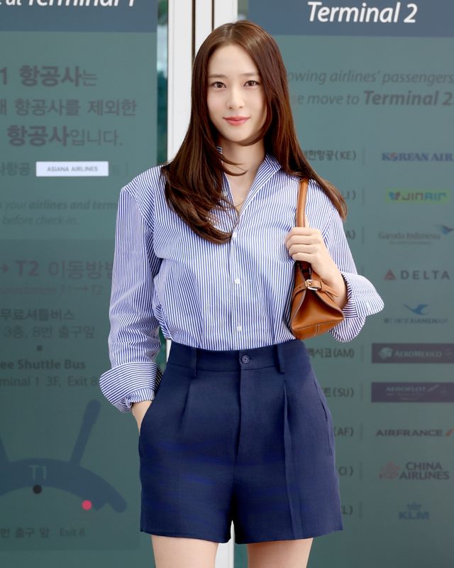 출국에 앞서 정수정(크리스탈)은 랄프 로렌 컬렉션의 아이코닉한 카프리 스트라이프 코튼 셔츠와 리넨 소재의 쇼츠를 매치해 클래식하면서도 세련된 여름 스타일링을 완성했다. 여기에 유니크한 쉐입과 버클 디테일이 돋보이는 카멜 컬러 숄더백을 들어주며 럭셔리한 무드를 자아냈다.