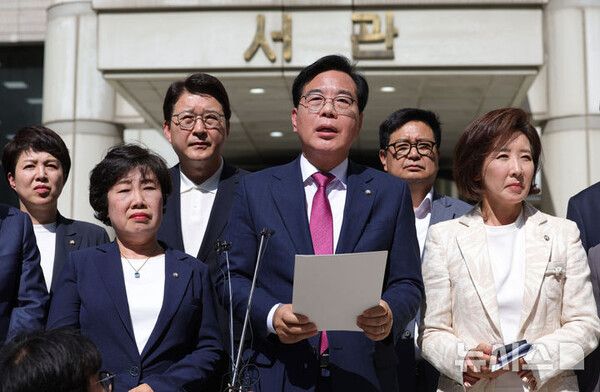 뉴시스 보도에 따르면, 송언석 국민의힘 비상대책위원장 겸 원내대표는 이날 오후 서울중앙지법 항의방문에서 "권력을 쥔 이재명 앞에서는 한없이 무기력하고 바람 앞에 먼저 누워버렸던 중앙지법이 야당 정치인에 대한 압수수색 영장은 특검의 입맛대로, 정권의 입맛대로, 사실상 특검이 시키는 대로 발부하고 있다"며 "여당무죄 야당유죄"라고 말했다.