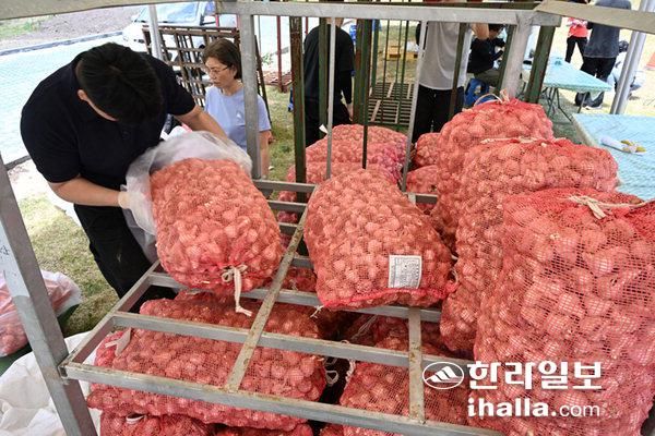 현장에서는 통마늘 50개 1만5000원/1망, 양파 1만원/15kg, 단호박 8000원/3kg, 수박 1만5000원/7kg, 감자 4000원/2kg에 각각 판매한다.