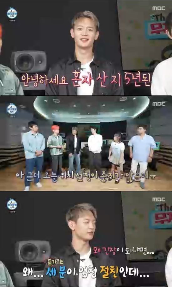 민호는 "혼자 산 지 5년 됐다"고 인사하면서 "위치 선정이 좋지 않다"며 양옆을 쳐다봤다. 민호는 키와 코드쿤스트 사이에 서 있었다.