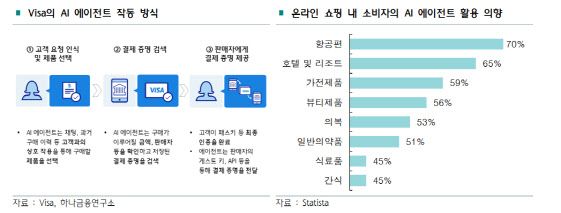 서유나 하나금융연구소 연구위원은 ‘AI 에이전트 결제의 시대, 글로벌 카드사의 전략’ 보고서에서 “비나(Visa)는 지난 4월 연례행사에서 ‘비자 인텔리전트 커머스’를 공개하며 자사의 결제 네트워크를 AI 에이전트 개발자에게 개방한다고 발표했다”며 “AI 에이전트가 결제에 대한 신뢰를 얻게 되면 검색, 비교, 선택, 결제에 이르는 구매 활동을 AI에 맡기는 새로운 커머스 시대가 펼쳐질 전망”이라고 강조했다.