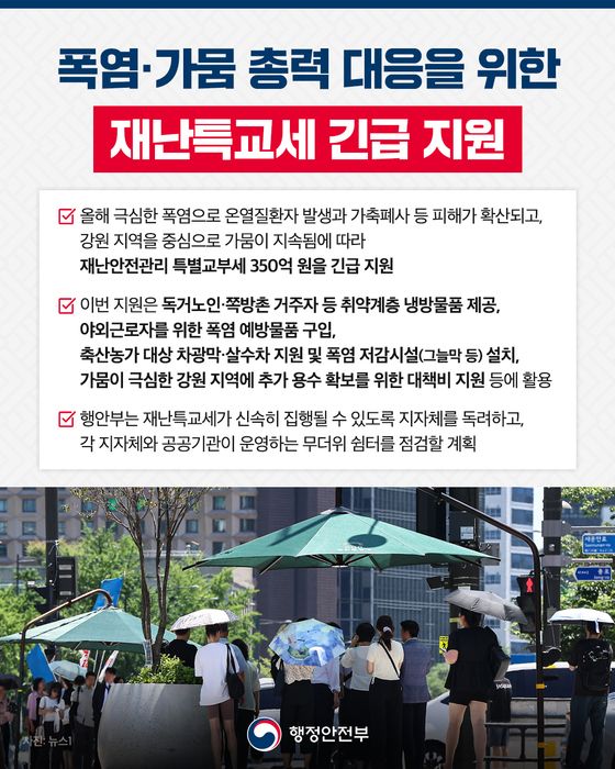 행정안전부는 올해 극심한 폭염으로 온열질환자 발생과 가축폐사 등 피해가 확산되고, 강원 지역을 중심으로 가뭄이 지속됨에 따라 재난안전관리 특별교부세 350억 원을 긴급 지원한다고 11일 밝혔다.