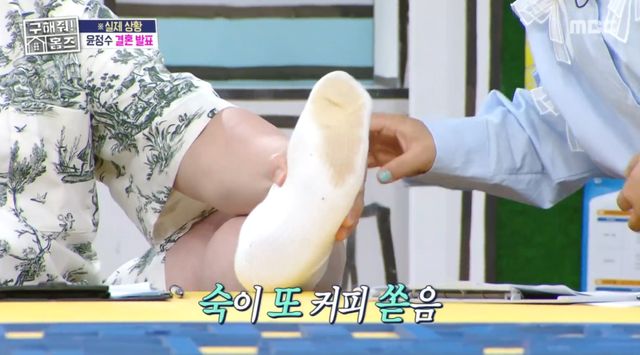 그때 윤정수가 발을 들며 폭로했다. 그는 "죄송한데 김숙이 제 발에 커피 쏟았다"라며 커피 얼룩진 흰 양말을 보여줬다. 이에 김숙은 "하필이면 쏟아도 윤정수 발에 쏟았다"라고 밝혀 현장을 다시 한 번 폭소케했다.