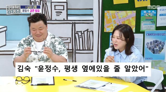 10일 방송된 MBC '구해줘! 홈즈'에서는 윤정수가 결혼을 발표하며 화제를 모았다. 특히 눈길을 끈 것은 김숙 반응. 두 사람은 과거 가상 부부로 활약하며 큰 응원과 사랑을 받은 바 있기 때문.