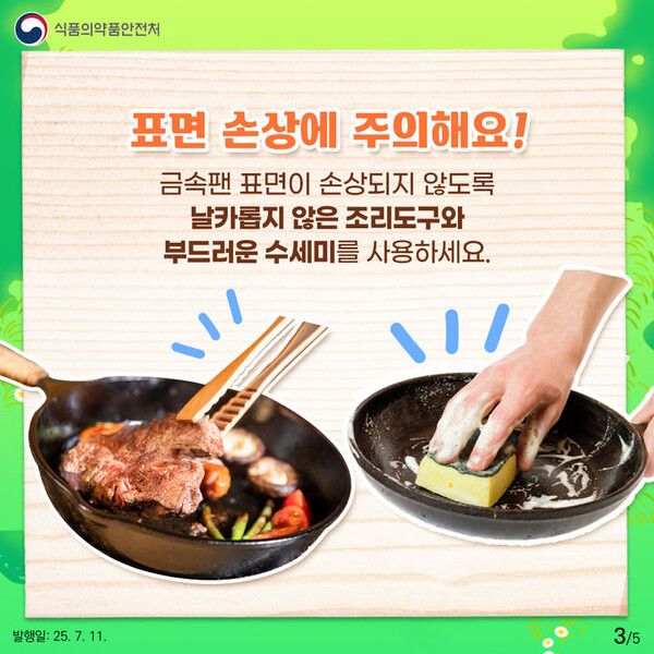 프라이팬 등 금속제 조리기구는 표면이 손상될 경우 알루미늄 등 금속성분이 용출될 가능성이 있다. 날카로운 조리도구는 사용하지 않고 세척 시에도 부드러운 재질의 수세미를 사용하는 것이 좋다.
